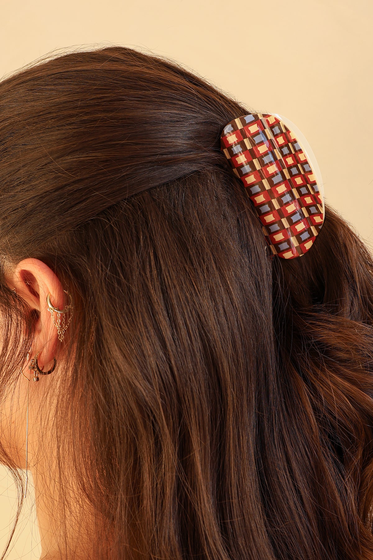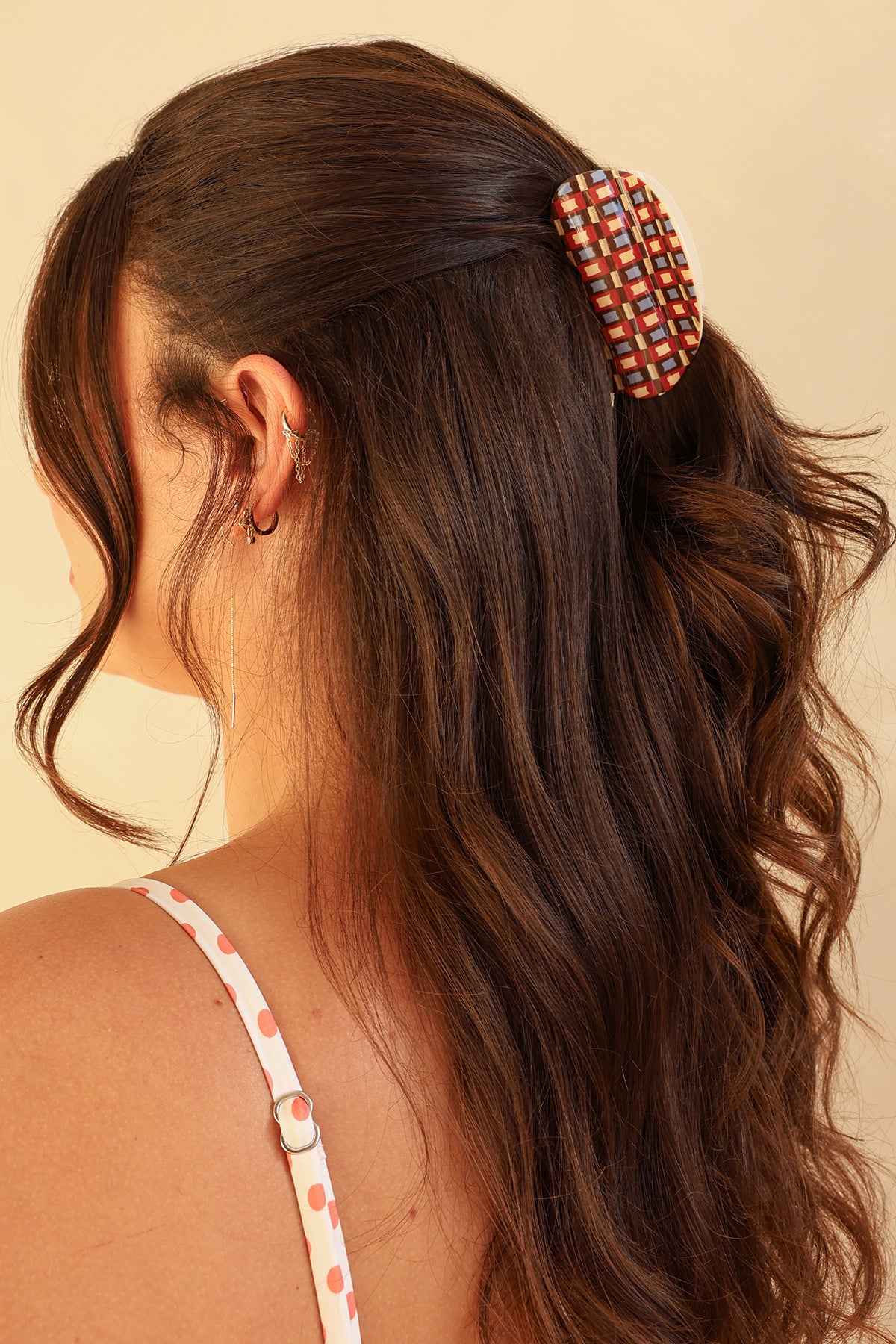 A printed claw clip made to effortlessly hold all of your hair in place while adding a touch of fun to any hairstyle.