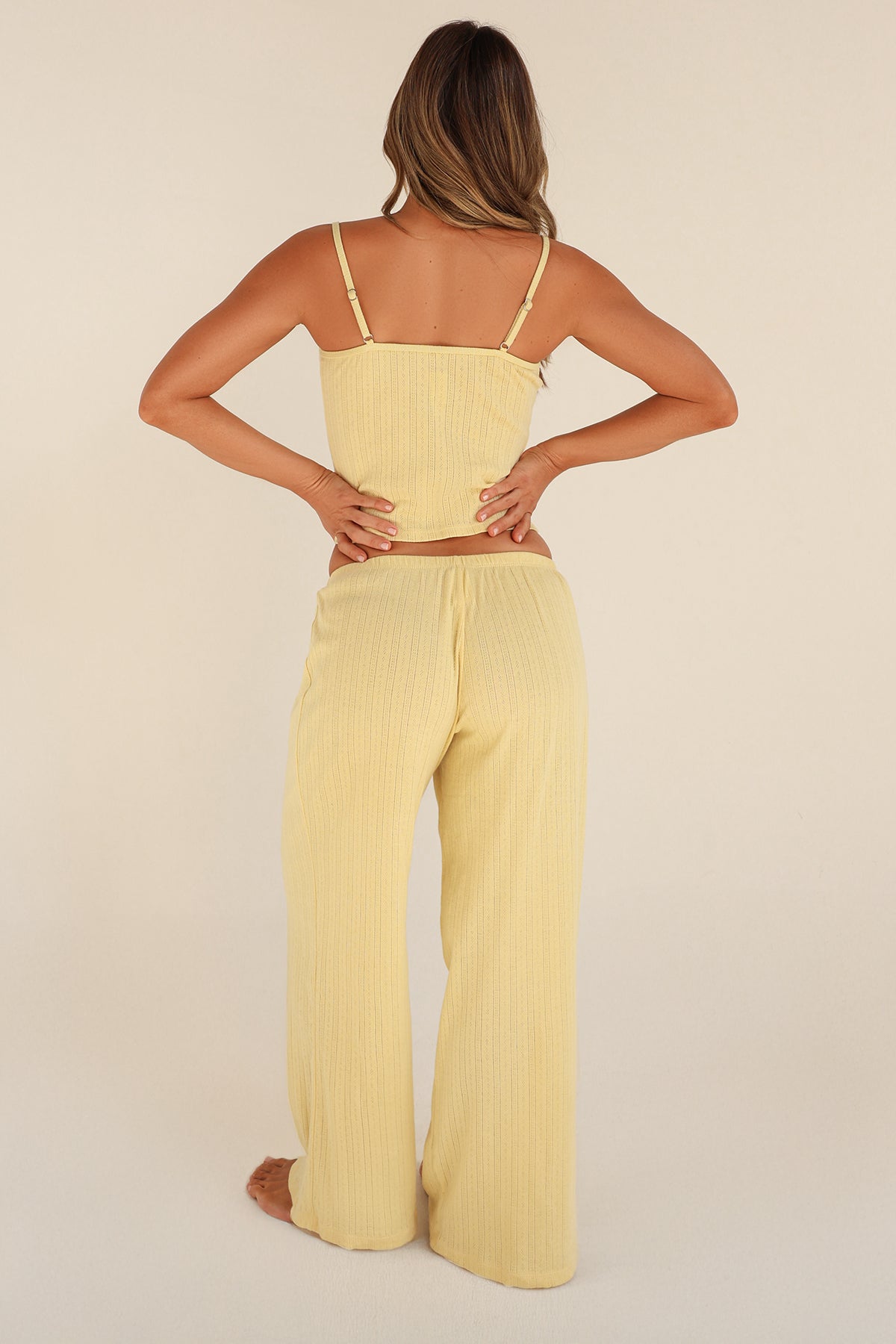 Our new butter yellow pointelle pants work as the coziest pajamas you’ll want to stay in all day long. Features a stretchy waistband and cutest mini bow accent at the center. Designed to be worn with our new Cupid Top.