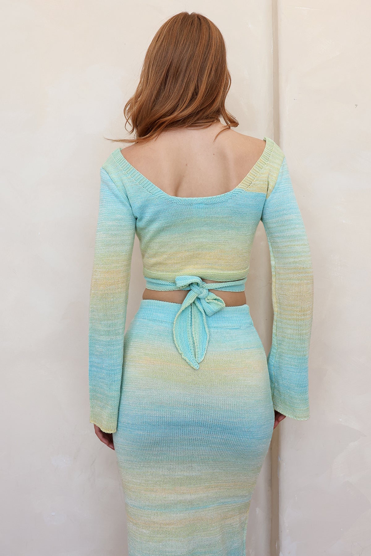 A knit wrap-style cover up top featuring bell sleeves. Wear it tied in the front for a flattering v-neck or wear it open to show off your favorite bikinis this summer. Pair with our matching Leena Skirt for a complete set.
