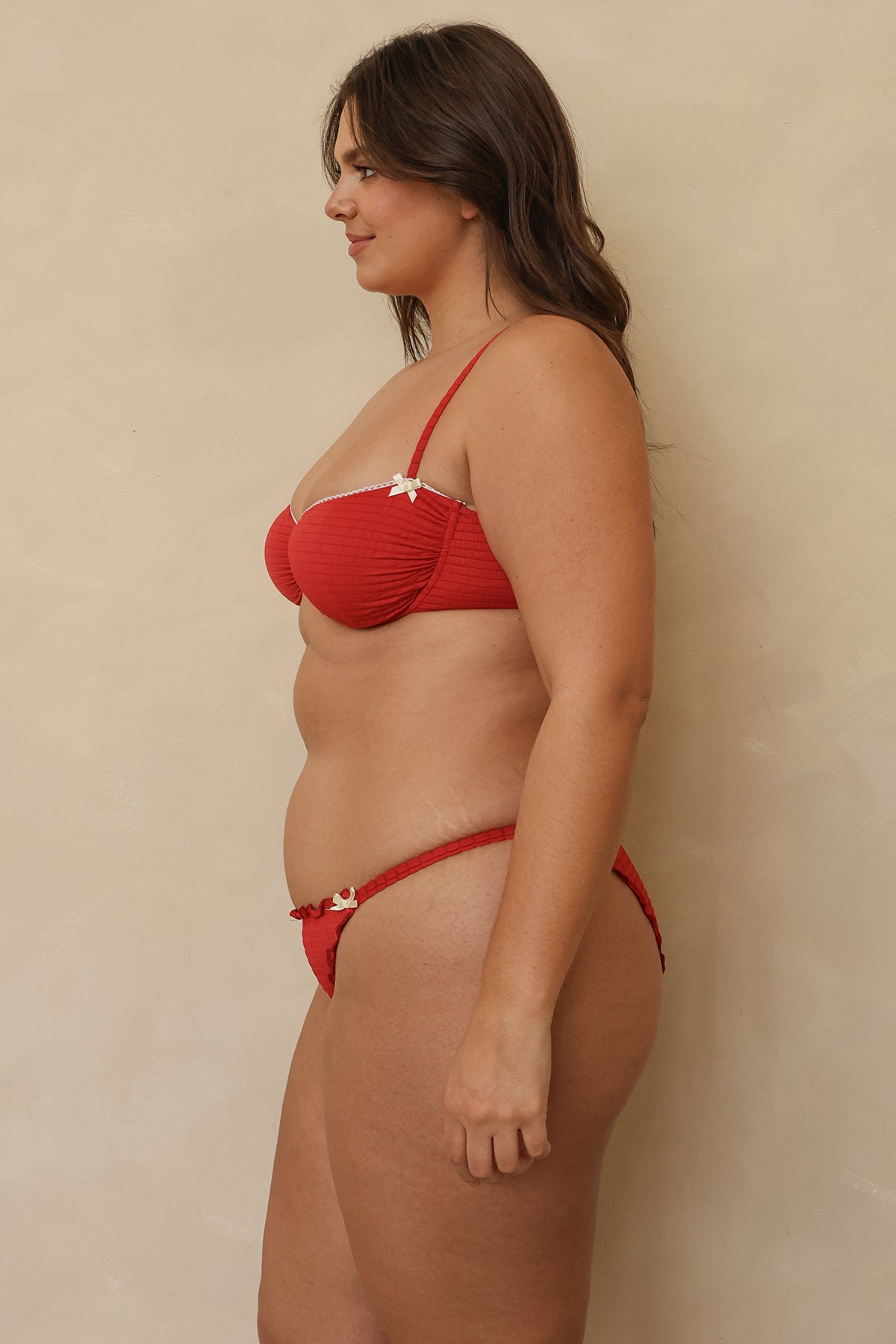 A new underwire bra-style bikini top featuring thin straps, mini bow details and a delicate ruffled trim at the top. Pair Ines with our Luisa Bottom or Lucca Bottom for a matching set.