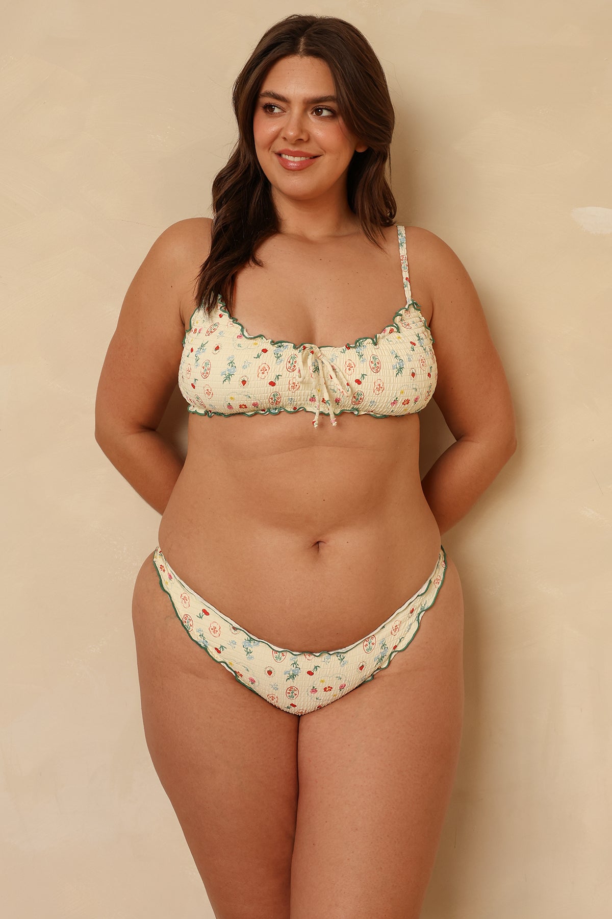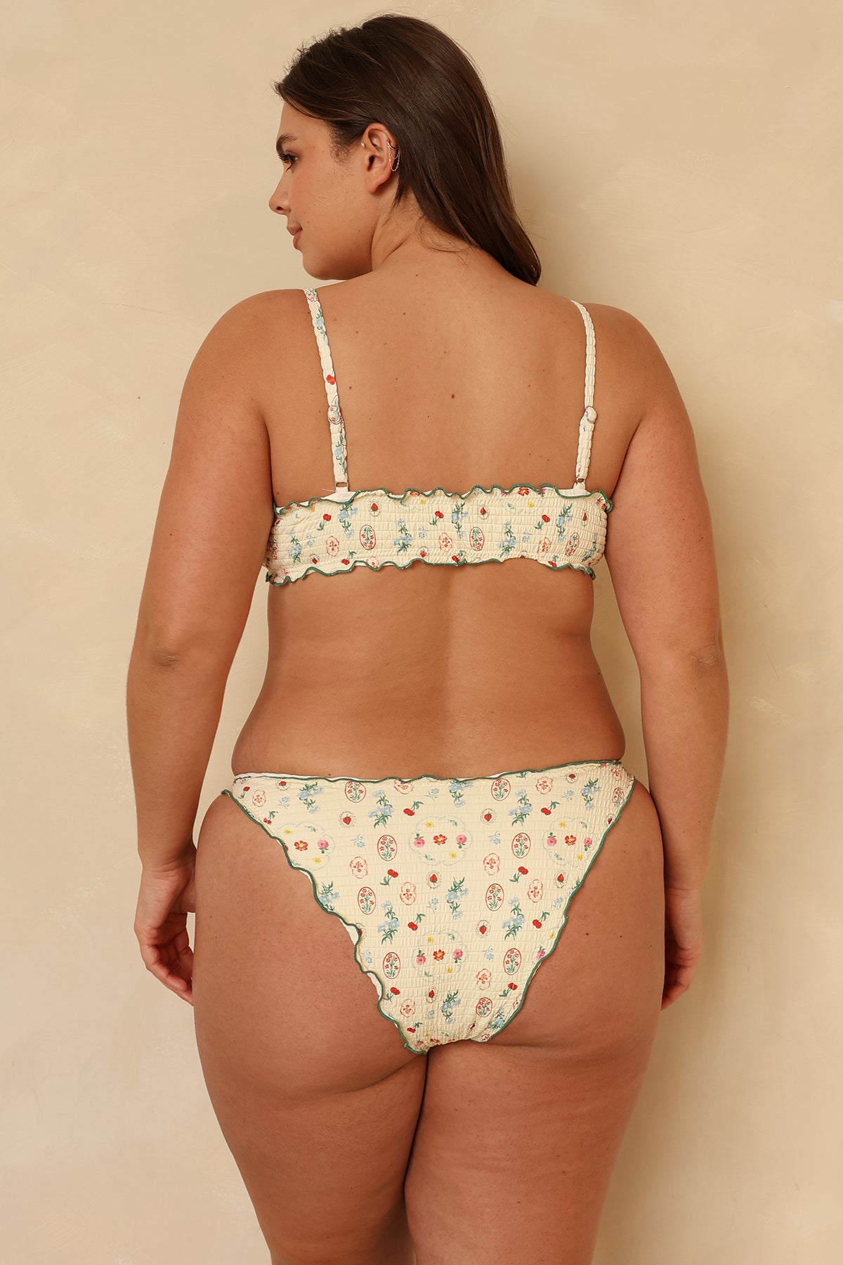 A scrunchy, cheeky-style bikini bottom designed with a gorgeous ruffled trim around the edges. Pair June with our Bonita Top for a matching set.