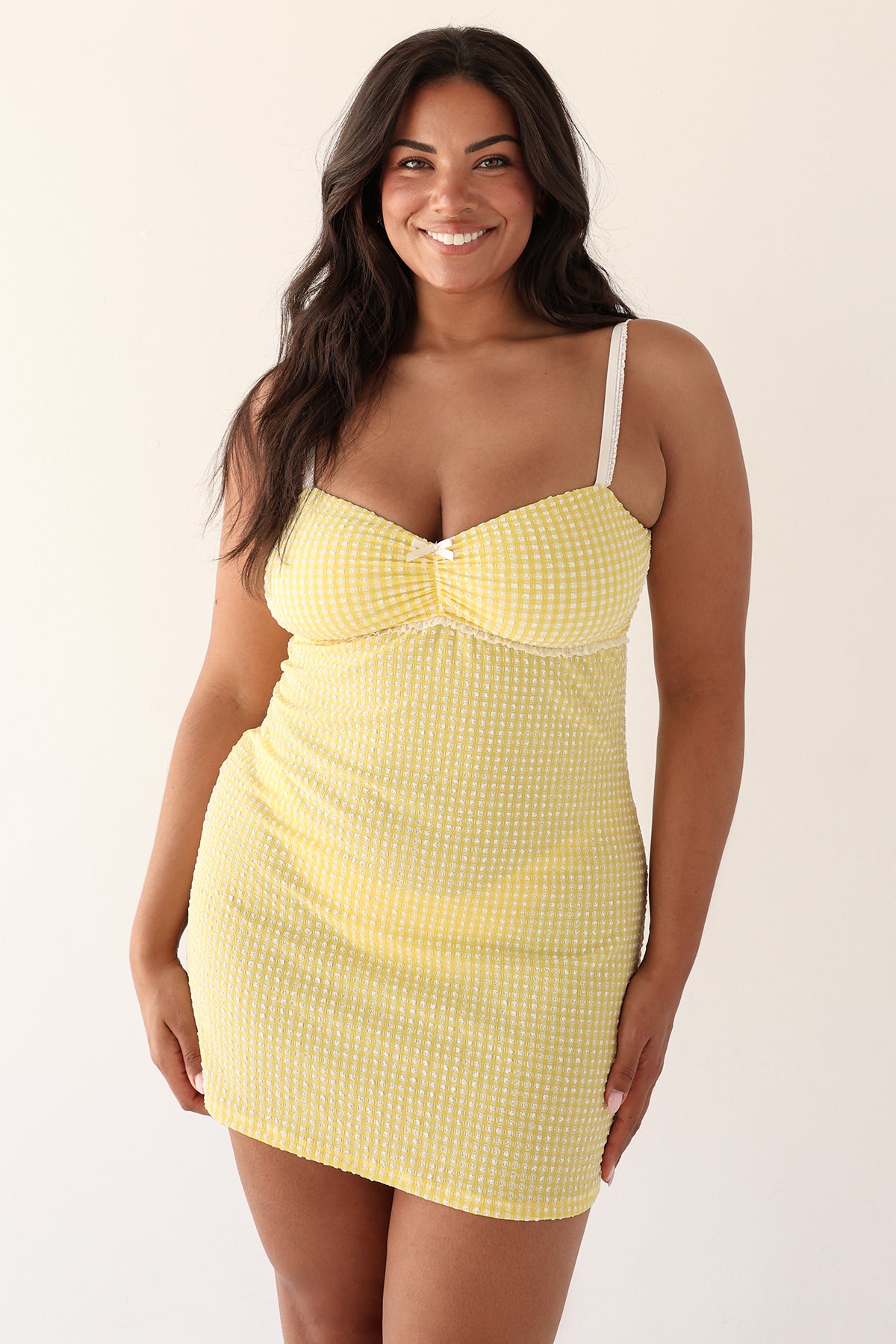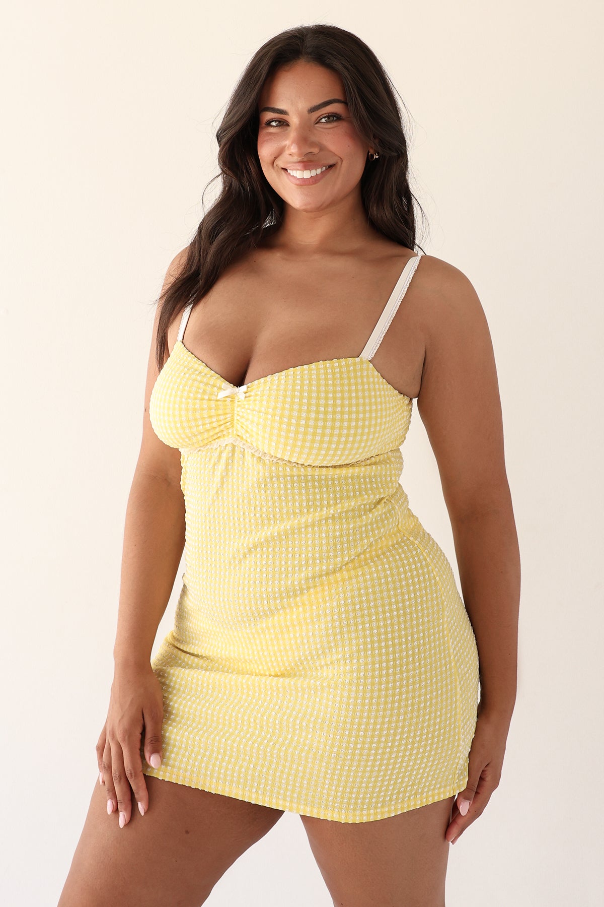 Our new sundress features flattering lace trim under the bra, a mini bow detail at the center and lace straps that adjust at the back. Designed in cute prints and hues from our Italia collection.